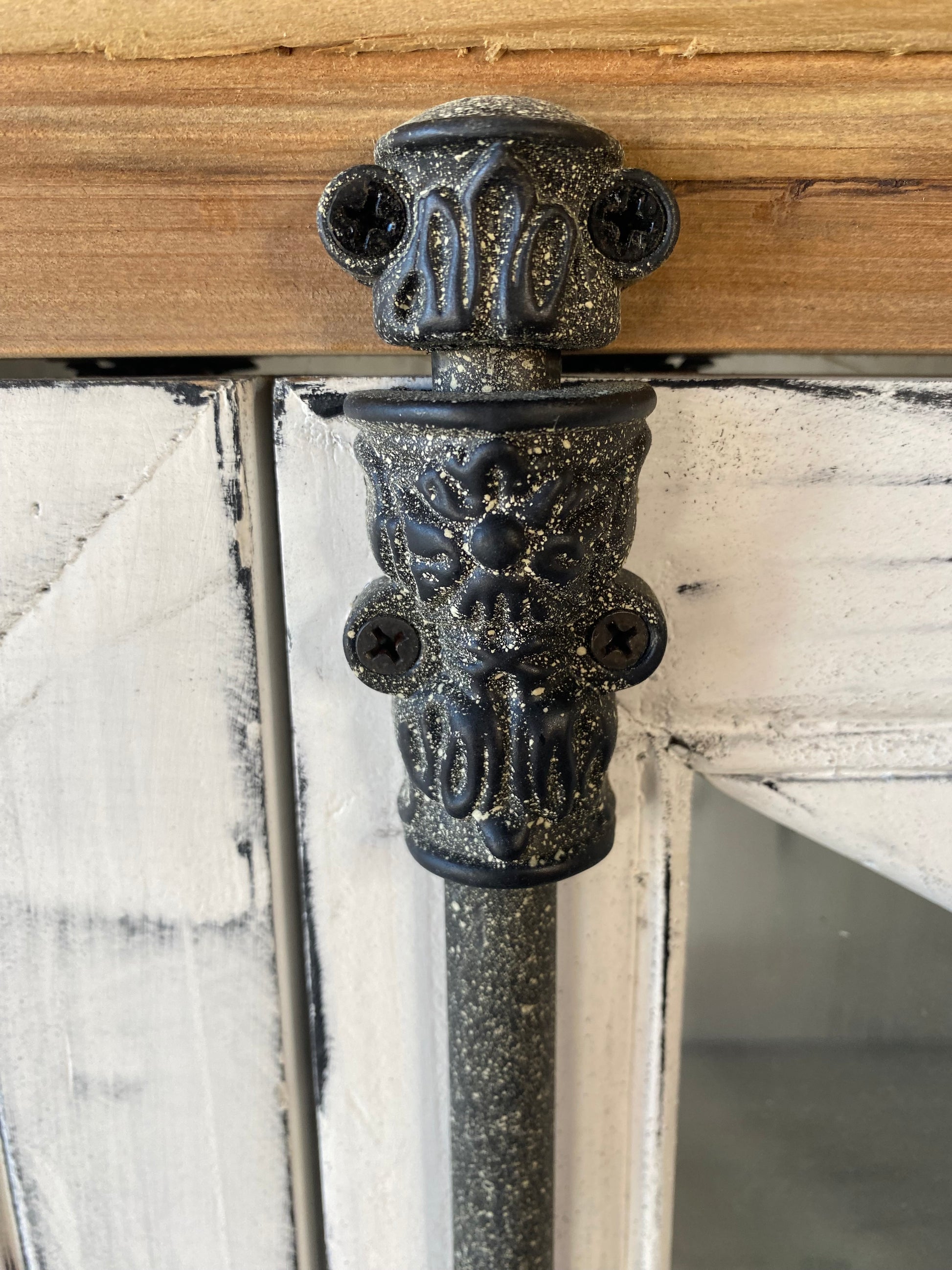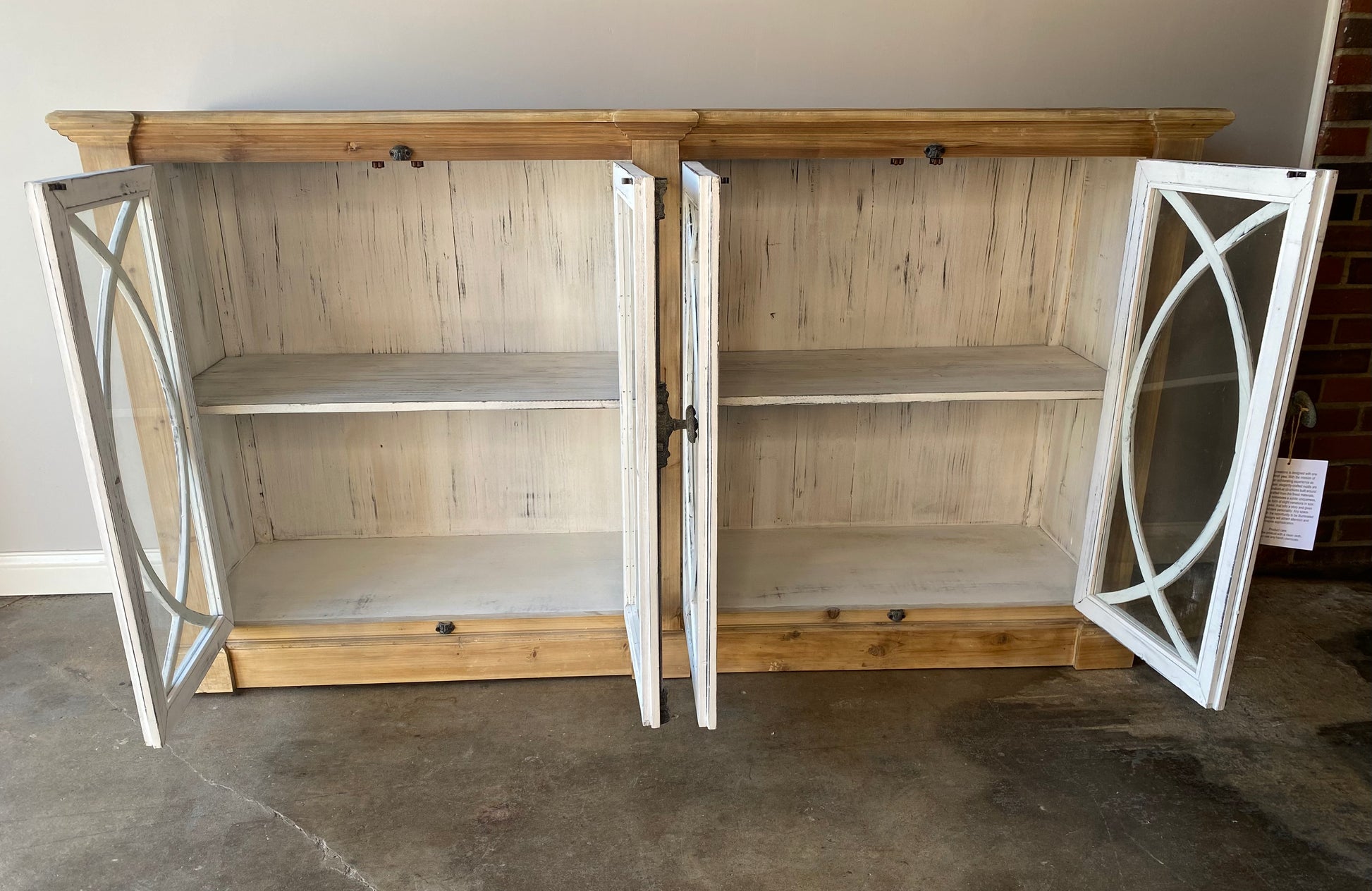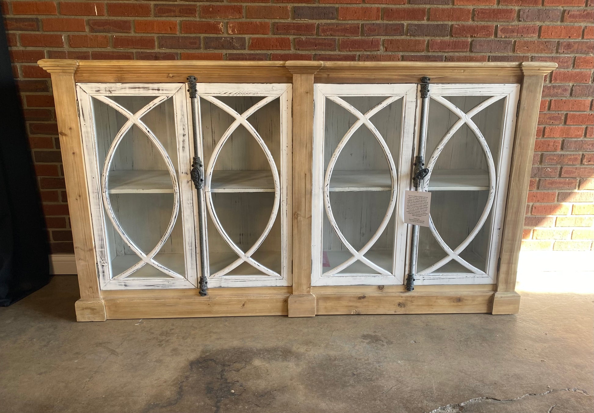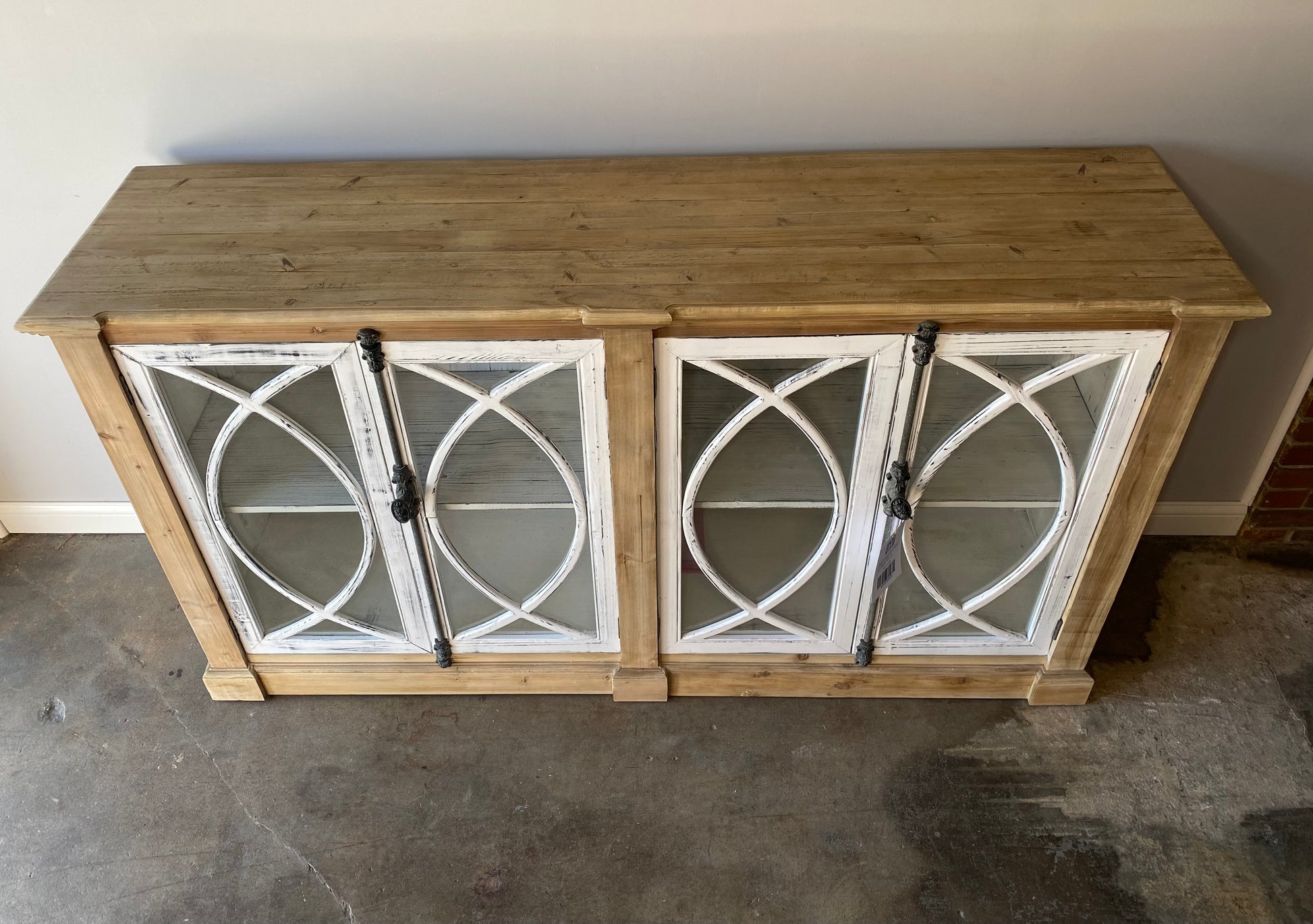 The glass doors, adorned with wine-cellar-like knobs, add a touch of sophistication and allow you to showcase your prized possessions. But what truly sets this sideboard apart is its revolutionary two-tone finish. Graceful splashes of antique white on a natural finish create a striking visual contrast, elevating the overall appeal of this piece with elegance and commanding sophistication.
