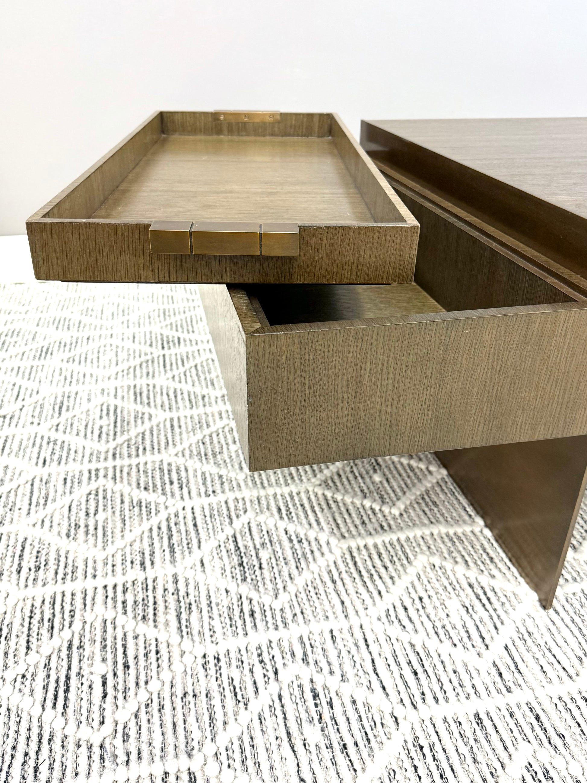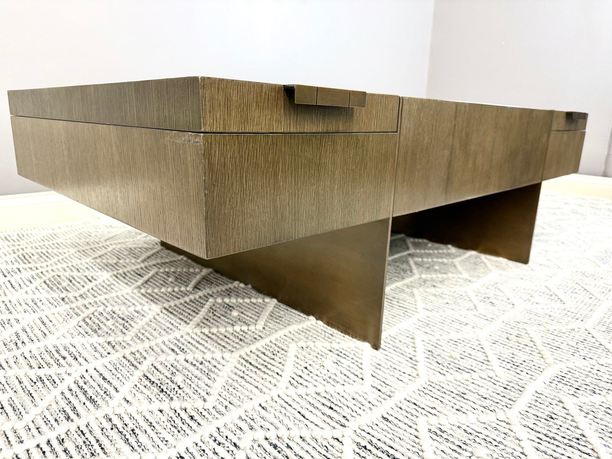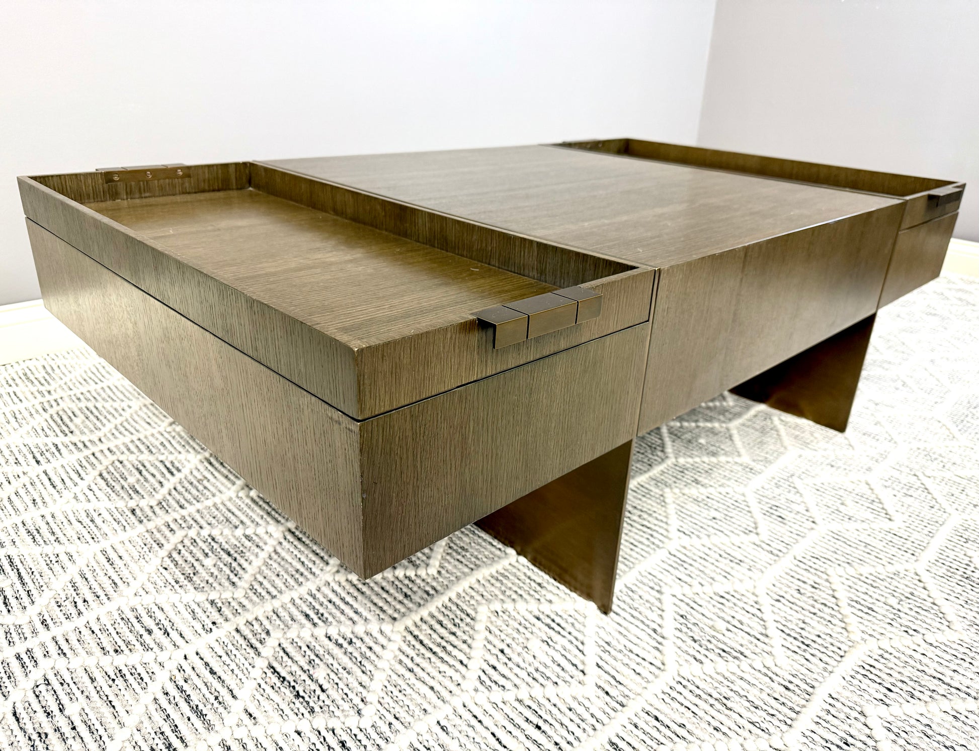 Theodore Alexander at its best. Sleek, timeless design with substantial brass legs and hardware. Quartered oak veneer in excellent condition with minimal blemishes. Two removable trays with convenient storage.