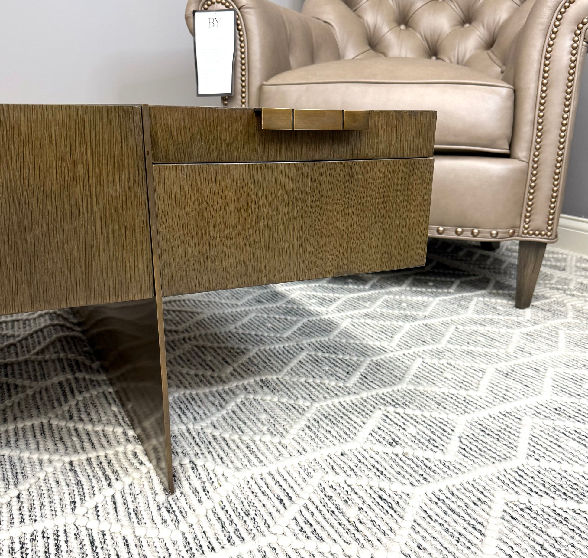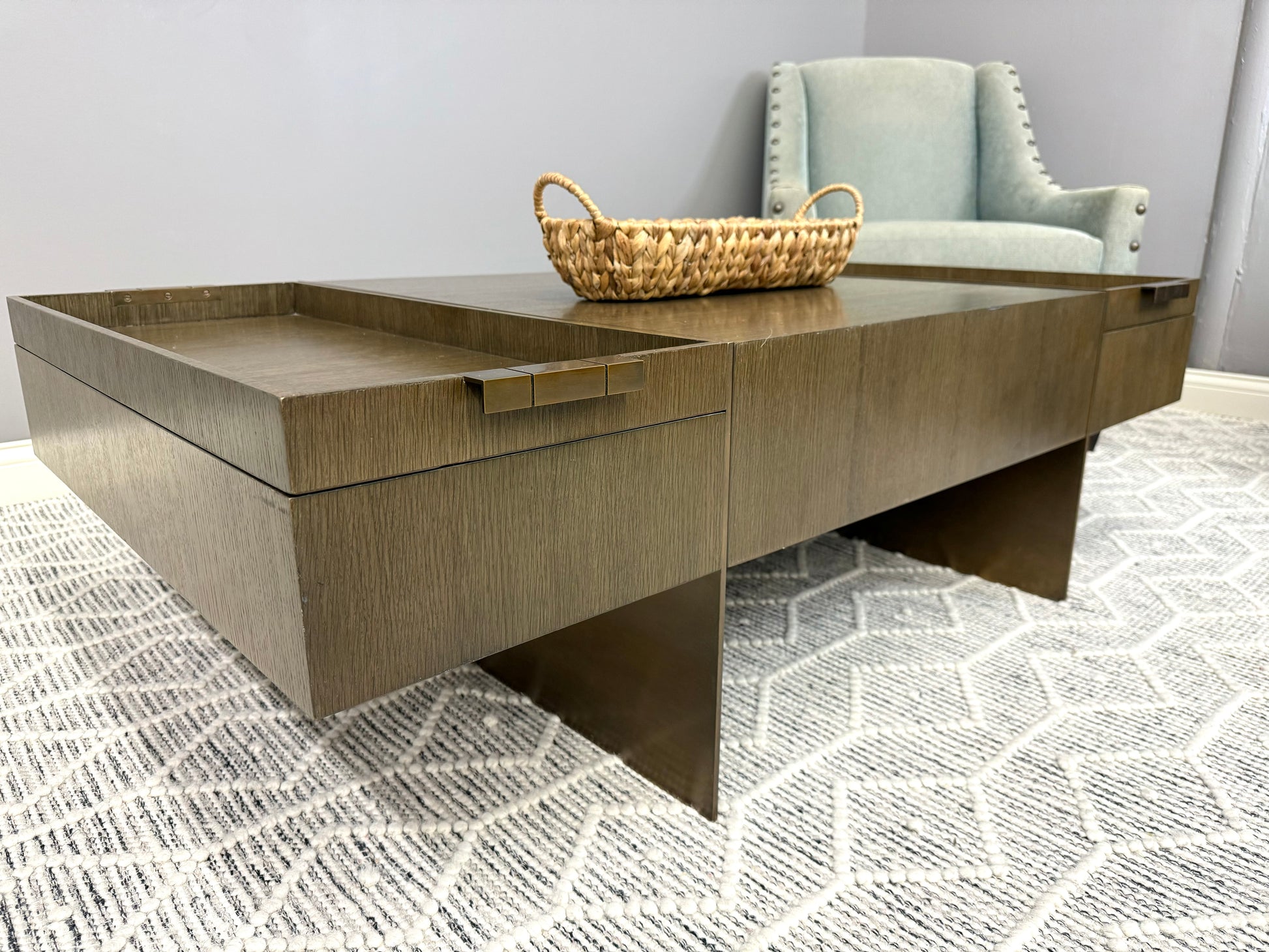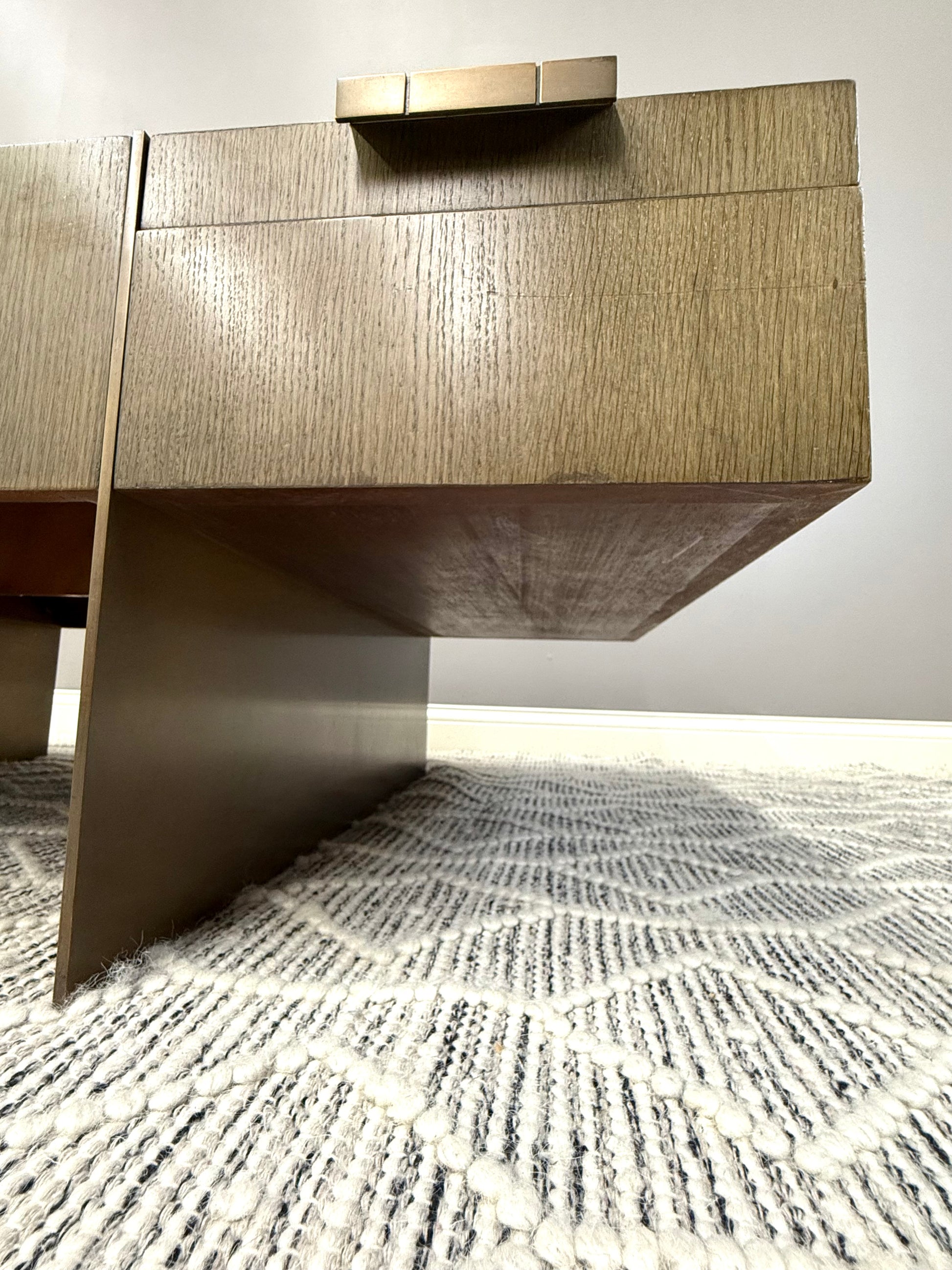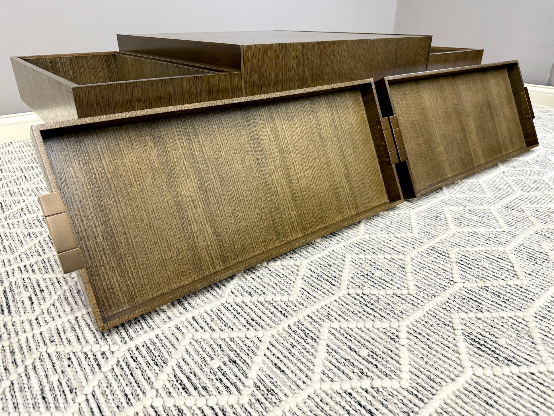 Theodore Alexander at its best. Sleek, timeless design with substantial brass legs and hardware. Quartered oak veneer in excellent condition with minimal blemishes. Two removable trays with convenient storage.