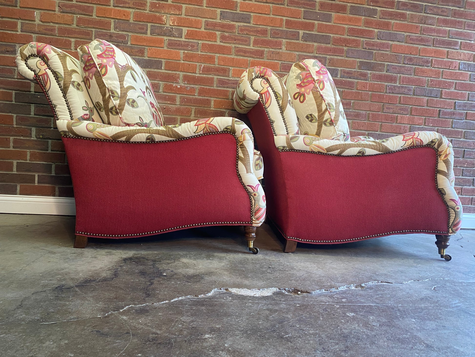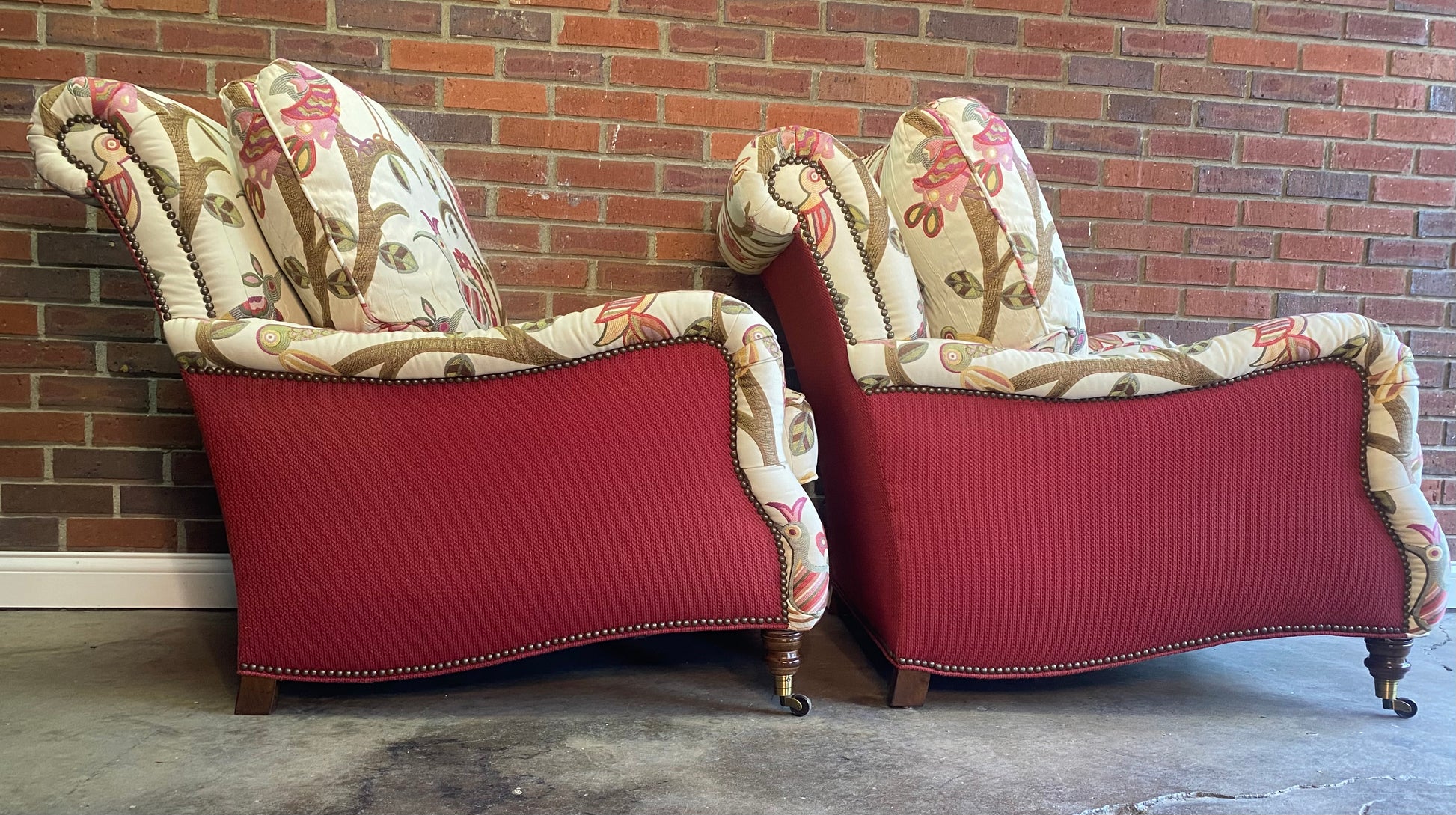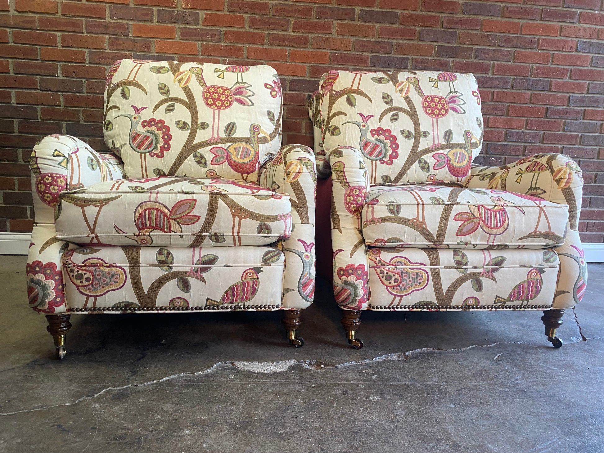 Excellent condition custom Vanguard club chair set in a fantastic fabric. These are made by one of the best manufacturers in the country for furniture. Everything about these chairs, screams luxury.