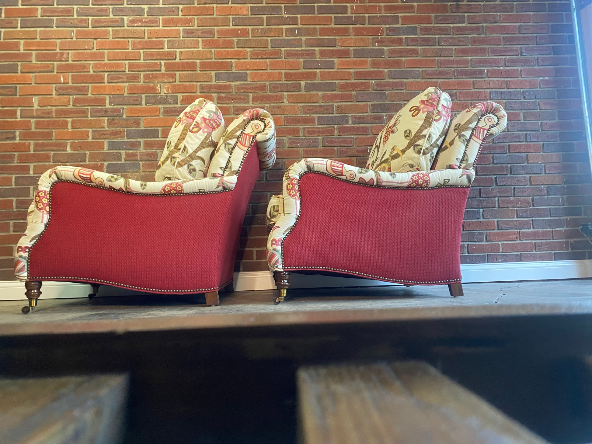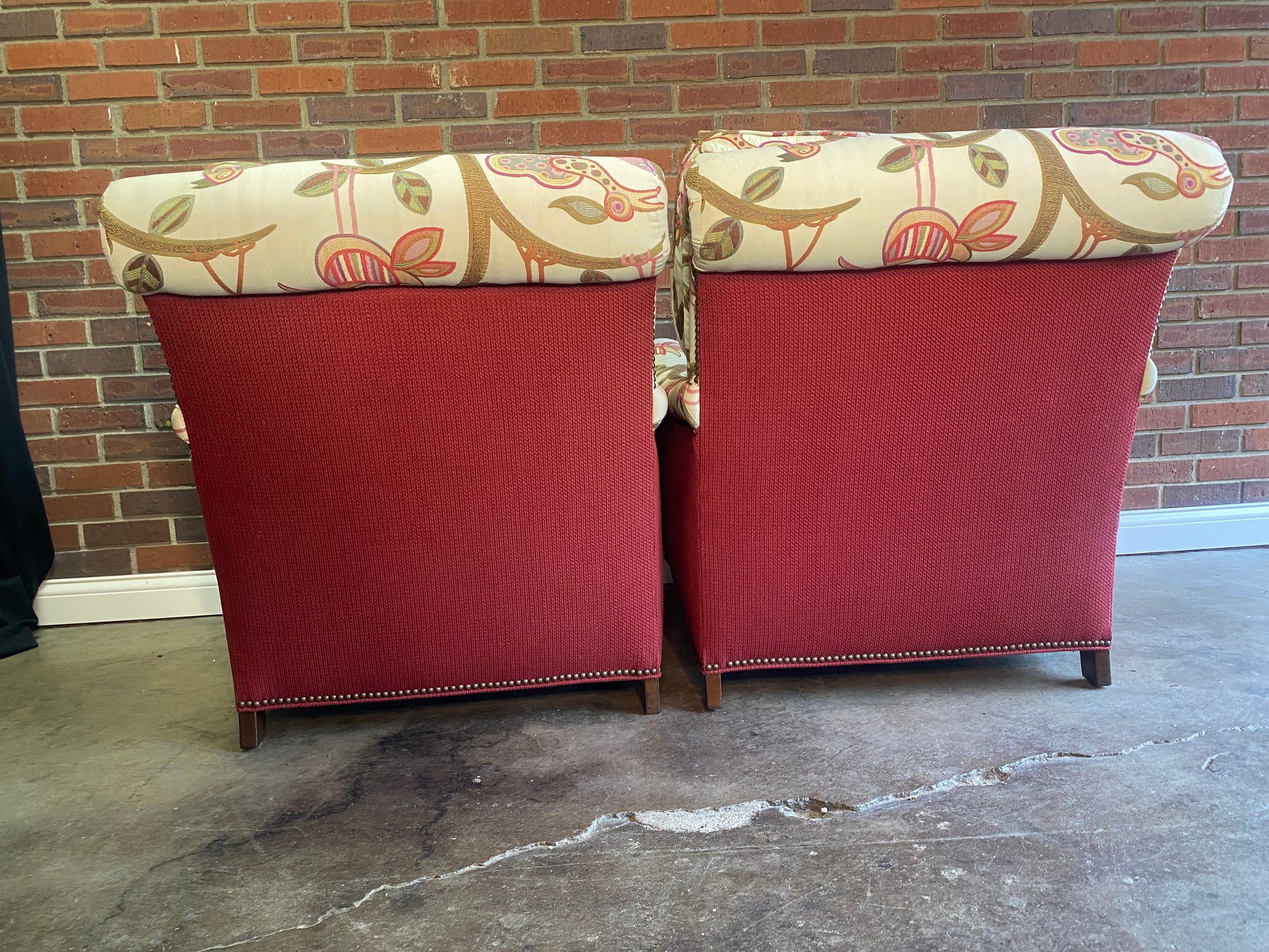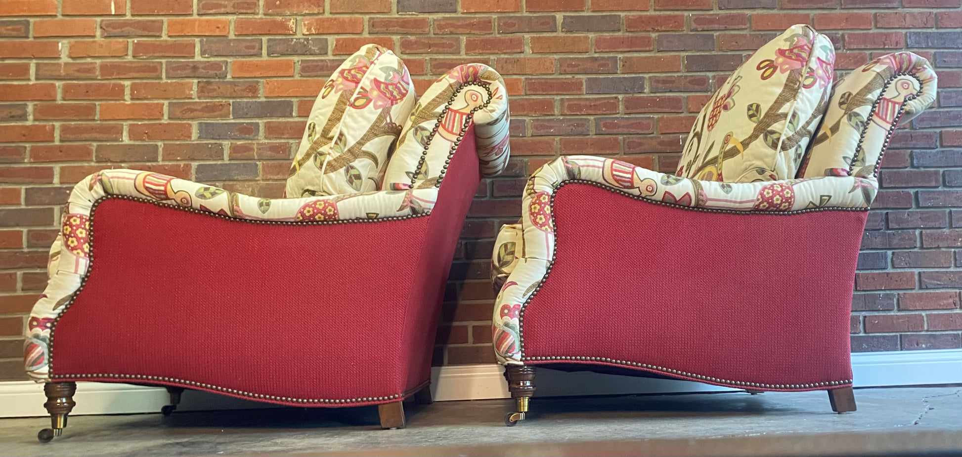 Excellent condition custom Vanguard club chair set in a fantastic fabric. These are made by one of the best manufacturers in the country for furniture. Everything about these chairs, screams luxury.